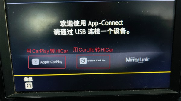 连接盒子后,安卓车机即打开对应的驱动软件,原厂车机即打开百度CarLife或者Apple CarPlay,片刻就会显示连接界面,如下图: