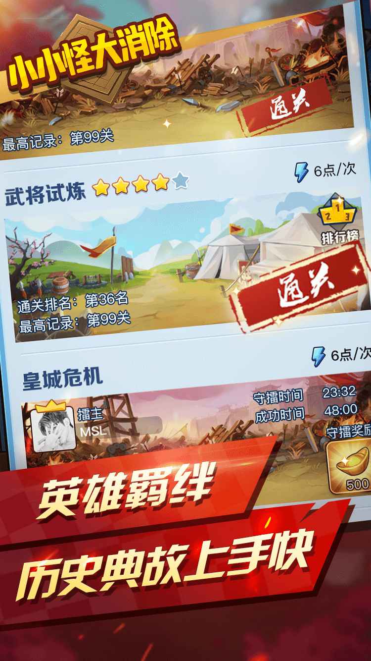 小小怪大消除无限体力游戏是一款热血沸腾的三国题材游戏,让玩家穿越时空回到那个英雄辈出的年代,体验皇权霸业的征途和血洗江山的豪情。游戏以其搞笑剧情和精彩系统,吸引了无数玩家沉浸其中,感受三国时期战斗的激情与策略。下载微信搜索小程序即可。