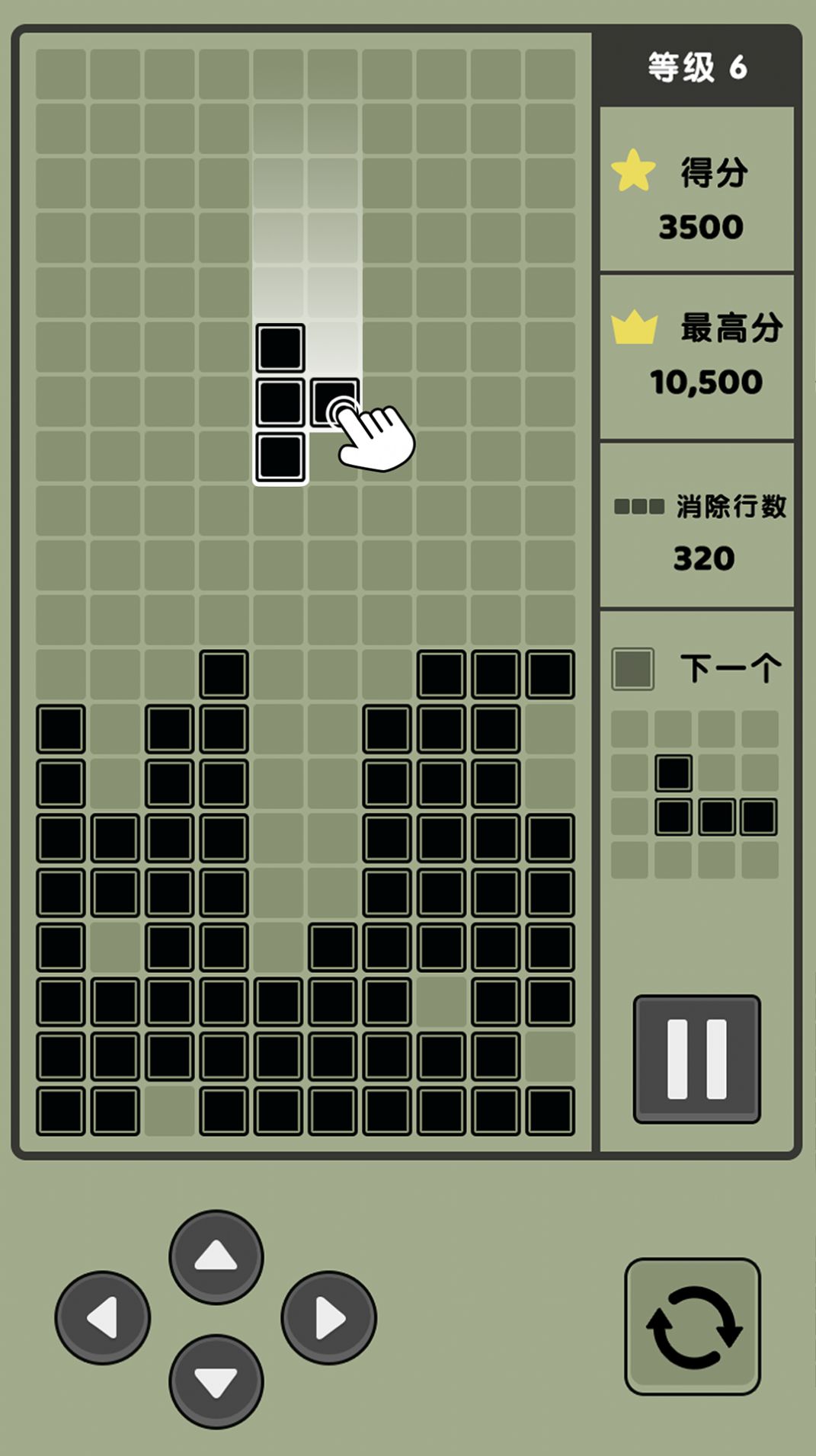 通过手指操作操纵俄罗斯方块的位置,将方块放置在合适的位置,填满横向的一行或多行。