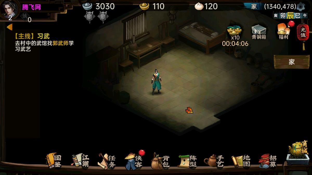 开局不久,你会有一次十连招募侠客的机会。十次招募是必得红色武侠的,前期着重培养该红色武侠,伤害足,打通天塔,过主线很快。红色武侠建议培养资质2.2的,基本每次十连招募都会出一个。