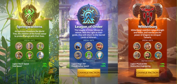 您首先从3个可用派系中选择一个,秩序联盟(人类)、Springwardens(精灵)和 Wilderburg(兽人)。每个派系都有自己独特的单位、建筑设计、能力和独特的英雄。然后你可以建立你的城市,收集资源,训练和部署单位与其他玩家作战,也可以结成联盟。