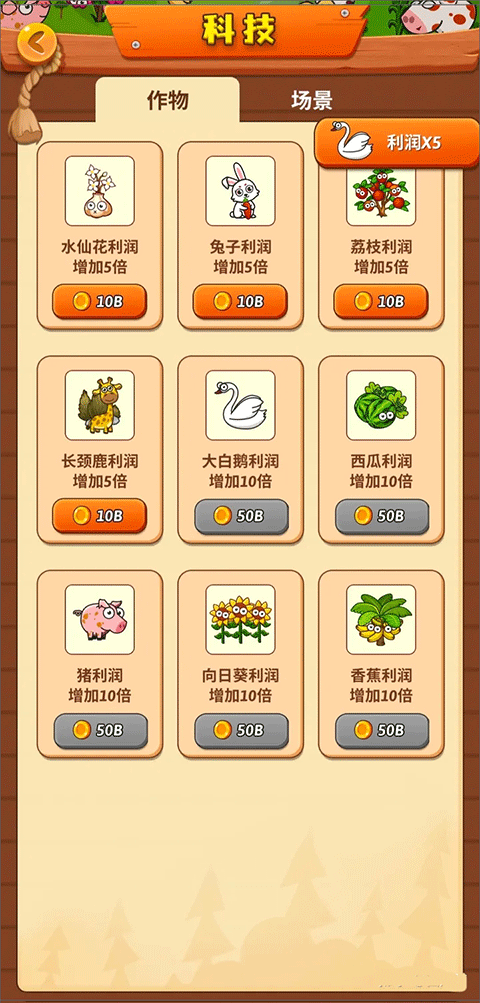 5、每个作物的产量不同,优先升级产量高作物的科技、产量、也就是从最贵的开始升级,然后把科技那一页全部拉平均升级,不要一个疯狂升级,这样只会浪费金币。