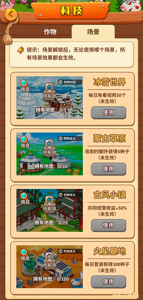 6、场景效果:,海滨农场,(作物全体收益加倍)冰雪世界(每日免广告30个)蒙古草原(收割时额外获得5种子)古风小镇(共同经营收益+50%)火星基地(莓日登陆即得300种子)