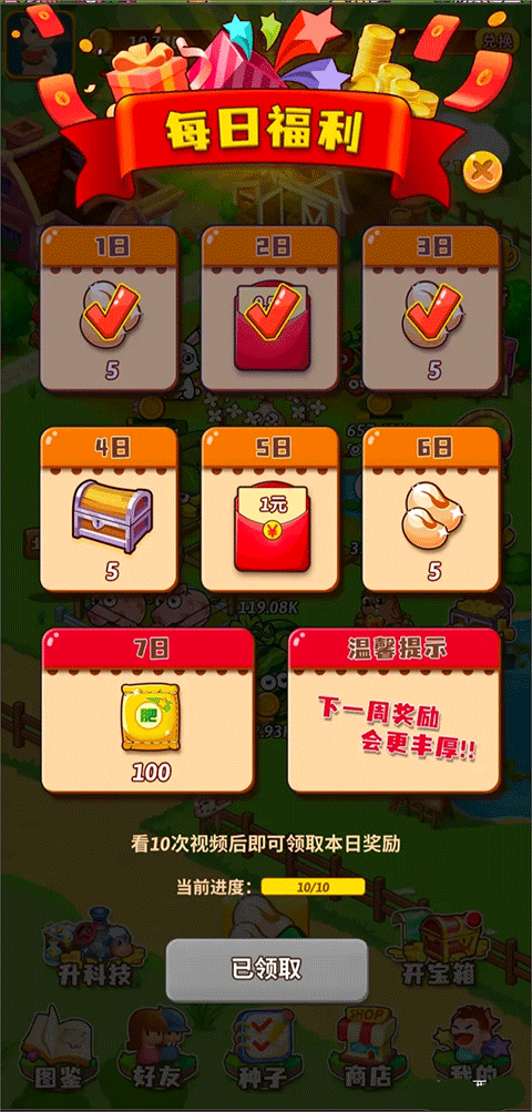 8、每天签到会得到现金奖励、种子、宝箱、化肥等、第二天就是现金红包了,后面还有,这个现金红包都是直接到账的,每天看10个视频以上就是完成了签到的意思,就可以对应每天的福利获得