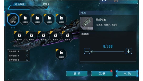 电池相当于舰船的护盾,装备更高级更多的电池可以提高舰船的血量(在PVE中会自动给每艘船装满电池)