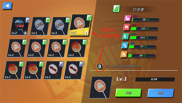 通过消耗其它球拍的经验来升级你的主球拍,一般是消耗低级球拍来升级高级球拍。萌新们一定要注意,可以将你的高级球拍锁住!锁住!锁住!别误吃啦!!