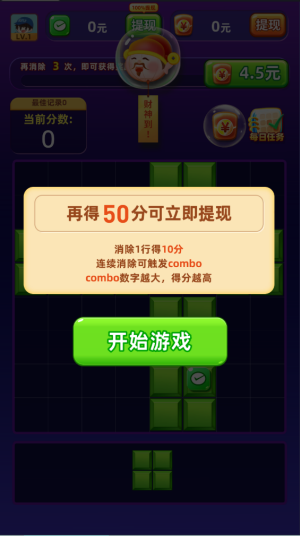 3.消除方块开始游戏挑战领取红包福利,完成游戏中的闯关任务