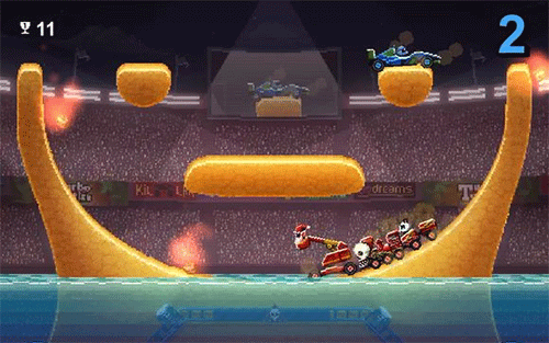 这个赛道和颠簸一样对车的性能要求较高,但与颠簸不同的是两边增加了大型旋转锯齿,所以更为更难做周旋。且这个赛道和更新之前仍做了一些变化,总的来说没什么特别大的影响,在开随机物品的情况下,体型不是很大的车压在两个炸弹上爆炸时可能会被炸飞到两个机械臂中间最终落到挡板上(如图)但这样做非常困难,我试了几十次也未能停在上面,只见过敌车这样过。这也并不会刷多少分,因为倒计时结束后会有大量陨石砸在上面很难幸免于难。说到车辆,重心不稳的车依然难以在这个赛道立足,车辆也需要能够进退自如,生死一般只在几秒之间。不推荐鬼火车,因为一旦冲过头想后退简直困难。