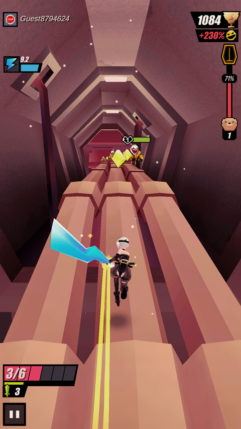 既然这是一款追求极致爽快感的游戏,目前来说是不够的~ 需要加强前期爽快感和刺激感,才有让玩家深入玩下去的动力~ 比如加快一些速度,比如一出门地上有个道具,一吃就加速,此时处于无敌模式,左右划动会砍空气并且加速,有障碍物的话也会全部破坏,效果可以做夸张一点~持续10秒左右。先让用户嗨起来,才能体验到游戏的乐趣。