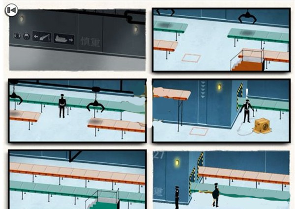 这章是最难的,玩家需要通过纸箱掩护自己通过传送带来过关,其中需要多次调整画面,其关键点是让箱子上到红色传送带,人物上绿色传送带,这样箱子就会在画面五落下,而人物从警察背后的绿色传送带出来