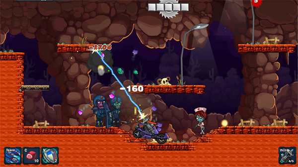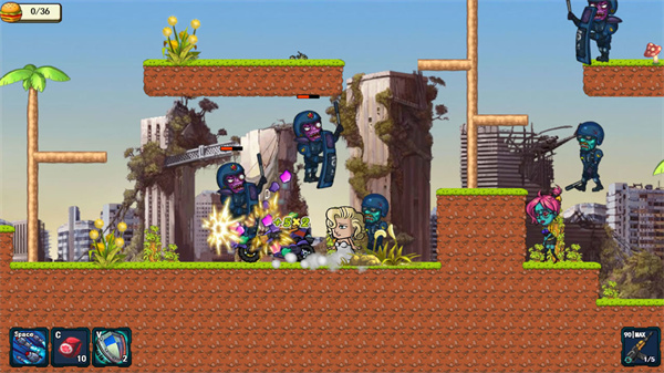 2、采用横板的像素卡通的画面,营造出一个的末日世界。