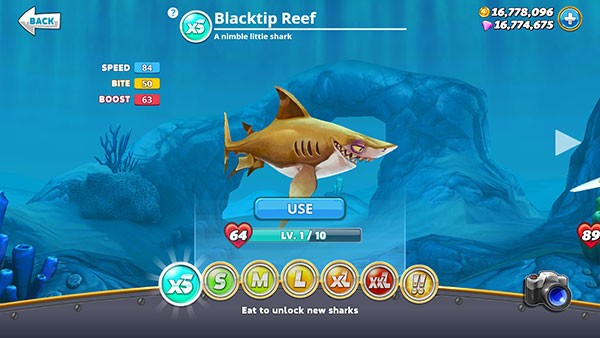 2、不断吞噬小鱼、海洋生物来提升自身等级,解锁新的技能与鲨鱼品种