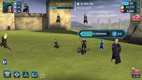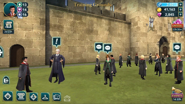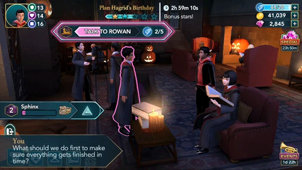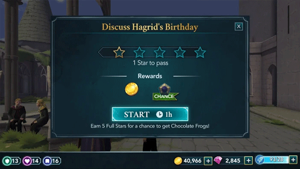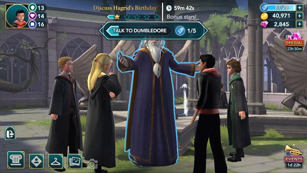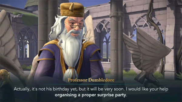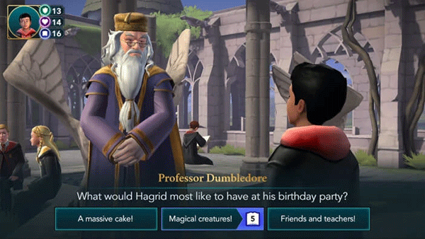 1、本演练将从一名二年级学生的角度介绍游戏。由于一年级及以上的学生可以参加冒险活动,因此根据你当前的主要故事进度,某些任务的星级和属性要求可能会有所不同。一旦你到了那里,你就可以和一些学生互动了。点击他们上方的演讲气泡,看看他们要对你说什么。之后,邓布利多会告诉你海格的生日很快就到了,他希望你帮他组织一个惊喜派对。