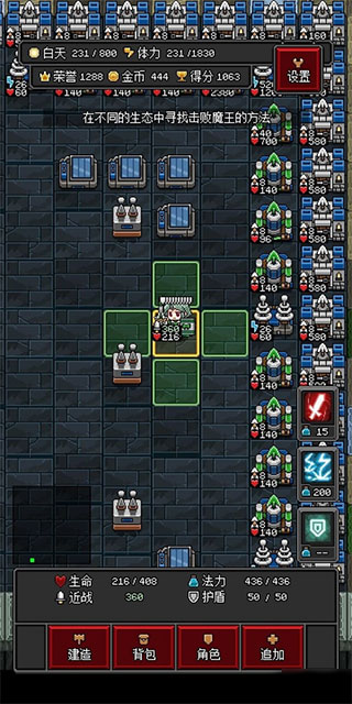 随着物资收集,在自己有能力守家以后可以在合适的地方建基地,此时要注意家中的规划,不能将东西随便乱摆不然发展以后会很麻烦,建议生产区和合成区分开,工作区就一个L型的地区就可以了,毕竟游戏道具有限。前面挖的矿可以做一点防御,晚上刷怪荣誉会很多,可以直接升级血量什么的(这里面技能是王道)基础攻击力不强,