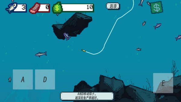 2、我们通过A、D键可以控制鱼钩钓鱼,越深的位置,鱼的质量越好。
