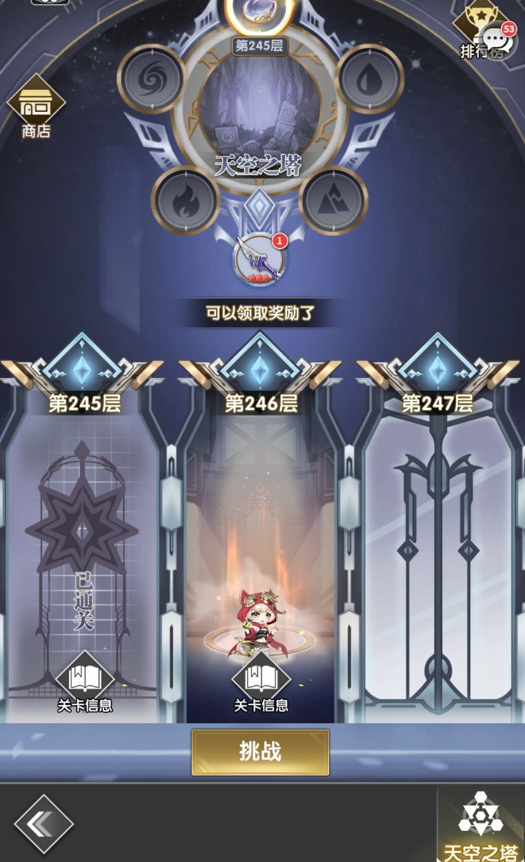 【功能介绍】进入玩法挑战下方显示关卡信息,页面内显示关卡奖励以及通关战力最低玩家阵容,卡关时可参考调整个人阵容进行挑战。点击上方通关奖励图标,可查看关卡奖励,奖励包含英雄装备、5星英雄碎片、限制水晶等内容(整数关卡为领主关卡,不可跳过)通关天空之塔,可提升额外主角经验产出,可在通关天空塔后,前往增益升级通关强化
