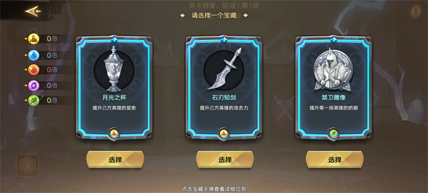 1. 成功通关小怪关与首领关后会出现3个宝藏,玩家可以从3个宝藏中选择获得一个,不同的宝藏会给予玩家队伍不同的增益效果或对敌方造成减益效果。