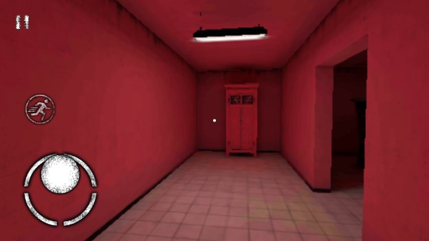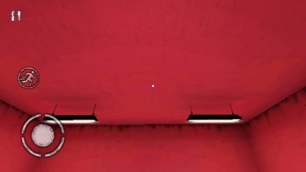 2、以第一人称视角进入后室,滑动左下角遥杆控制移动,滑动右侧屏幕可以转动视角,遥杆上方的按钮是奔跑