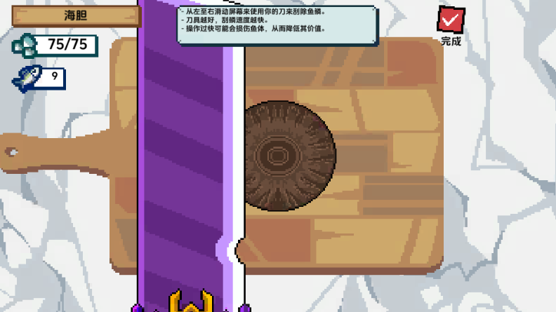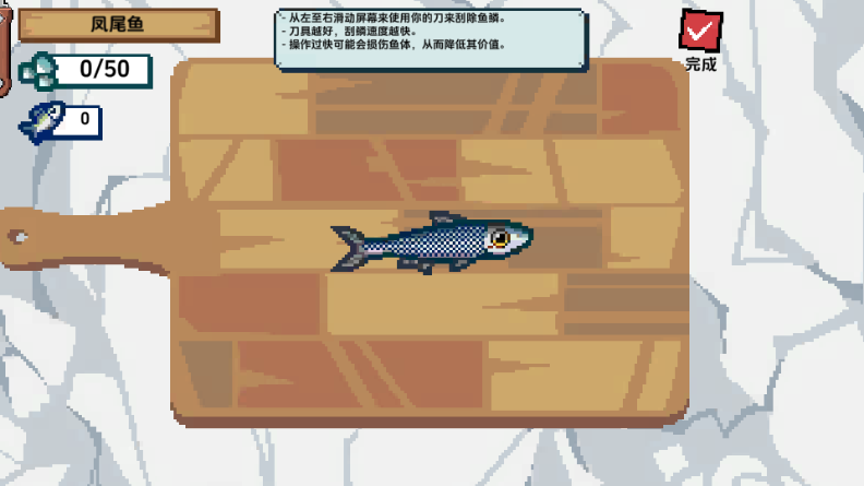1、从左至右滑动屏幕来使用你的刀来刮除鱼鳞
