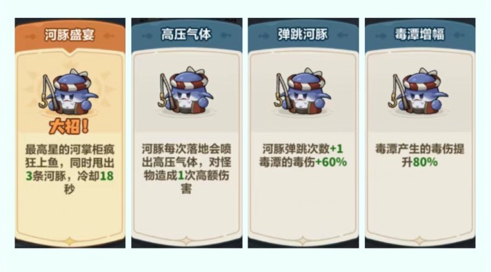 ① 【高压气体】极大地提升了河掌柜的爆发输出,配合大招和【弹跳河豚】,甚至能多次触发,连携效果强力