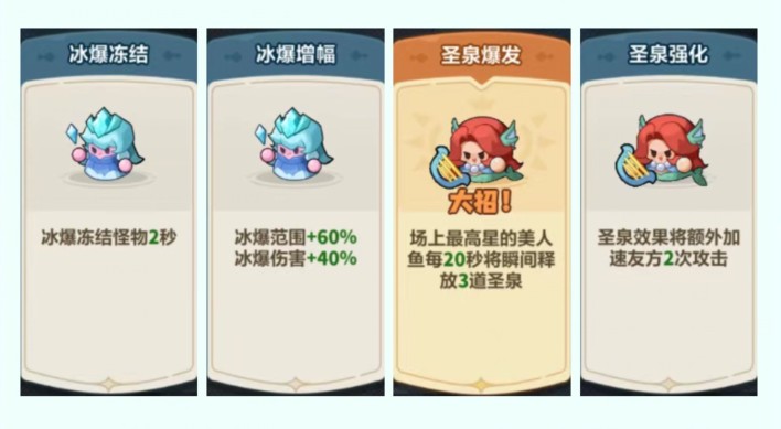 ① 以上4个强化词条,只有在没有刷新出于河掌柜、剑圣相关强化时,才会考虑选择,优先选冰法师的【冰爆冻结】和美人鱼的【圣泉爆发】大招。