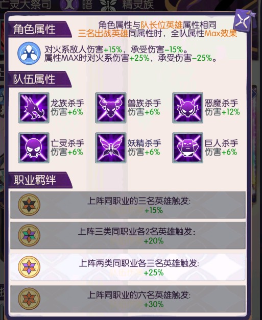 进入主楼层,点击左下方职业羁绊,会显示本游戏战斗的核心机制——角色属性、队伍属性、职业羁绊
