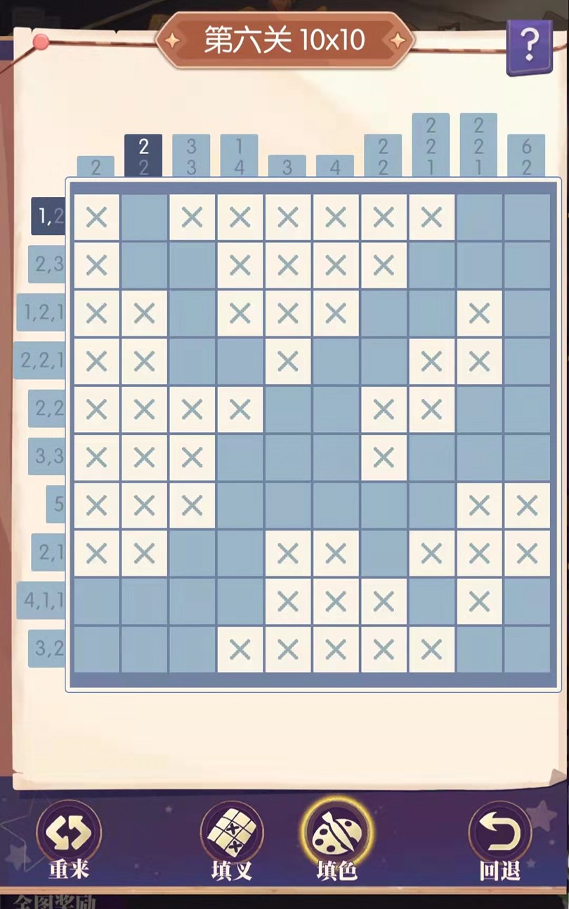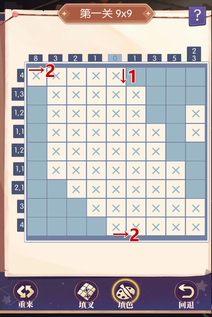 2,最终完成所有“填色”(填色后格子变成浅蓝色)即可,“填叉”(填叉后格子出现浅蓝色×)仅为辅助手段