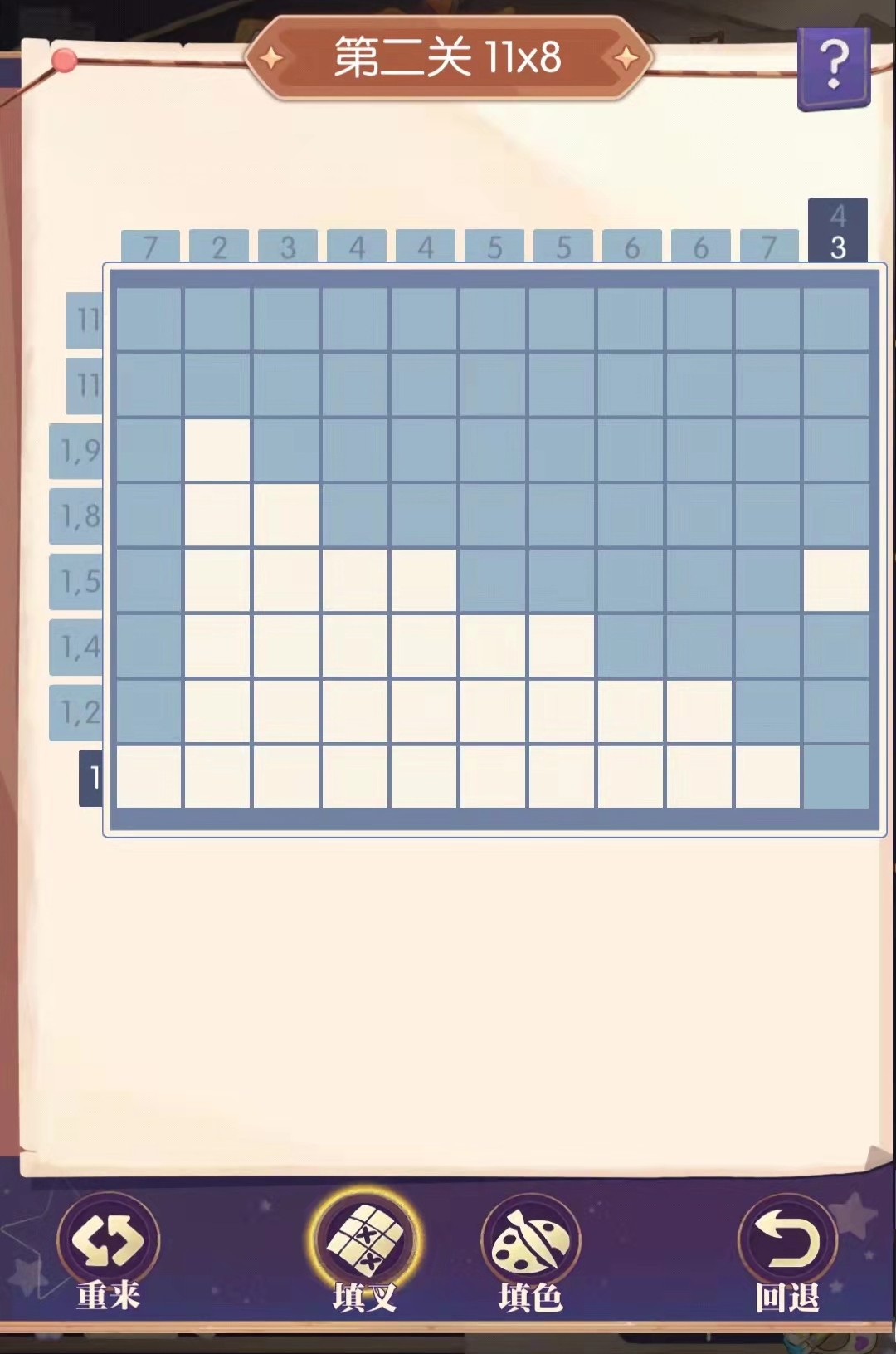 举例:第一关第二行1,3,表明第一行从左到右先有一个1个格子的填色格,然后在N个空白格后,有一个连续3个格子的填色格