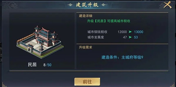 民居是游戏内征收铜币资源的主要获得方式之一,每天可征收3次,民居等级越高,所获得的铜币也就越高。