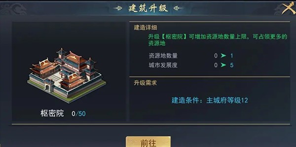 主城12级可建造的枢密院是决定的资源地可占领的数量,枢密院的等级越高,可占领的资源地也就越多。