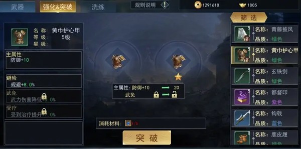装备可以通过消耗【昆吾石】来提升装备主属性的属性值,每突破一次装备增加1星,同时解锁一个新的词条。