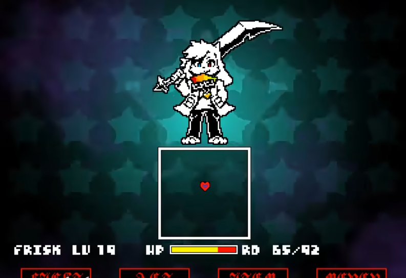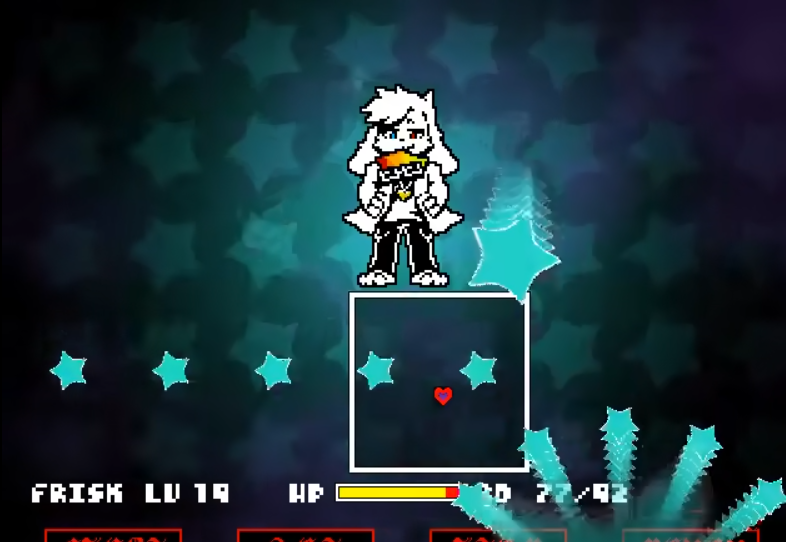 8、战斗方框:如果敌人选择攻击你(不论你是否选择主动攻击),在屏幕下方会出现一个方框,玩家操控这个心形对方框的图案进行躲避,一旦被触碰就会受到伤害,某类特殊图案即便是触碰了也不会受到伤害(如骷髅的蓝光)。