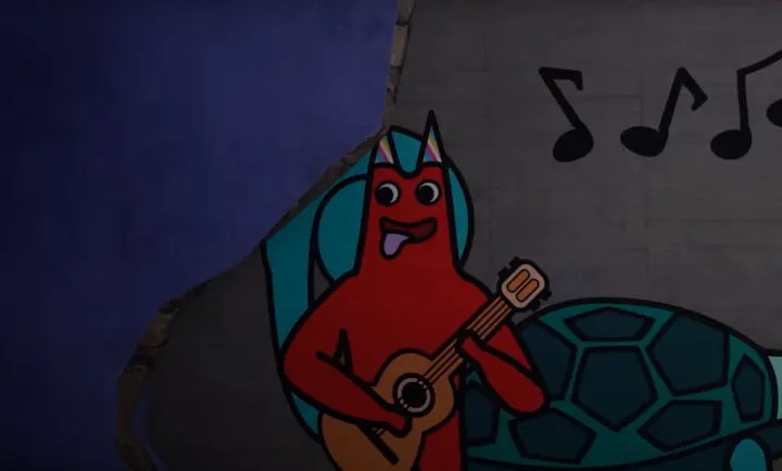 班班在濒死之际拿起了自己的吉他找回了自己的自己,有一张的磁带,长出了尾巴,三代地上也有吉他的,并且他的外号叫恶魔制作组说过,他有一个吉他但没有加进去并且医生说了,永远不要跟恶魔玩,一个是友好宽大的人格,压抑不住时会释放自己另外一个人格,外科医生最后把主角跳杀了,可能他与这个蓝色班班之间有不能让主角知道的秘密,另外说不定定会出现真正的幕后反派,因为达达杜先生在第六章结局说了他背后也是有人指使的。另外nanny为什么没有出现在壁画上?难不成还有第三方吉祥物阵营?