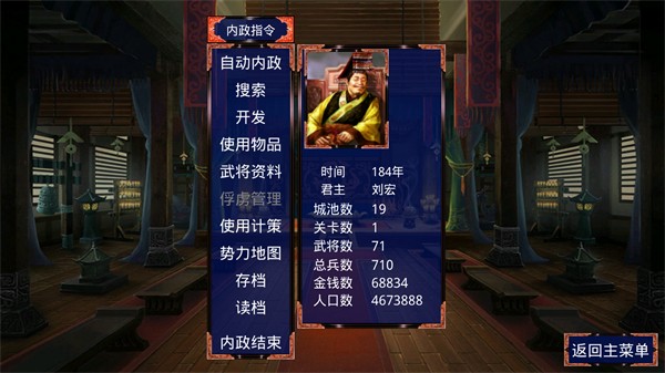 4、进入内政指令界面,在这里可以选择发动内政收服更多的能人异士,帮助你进行征战。