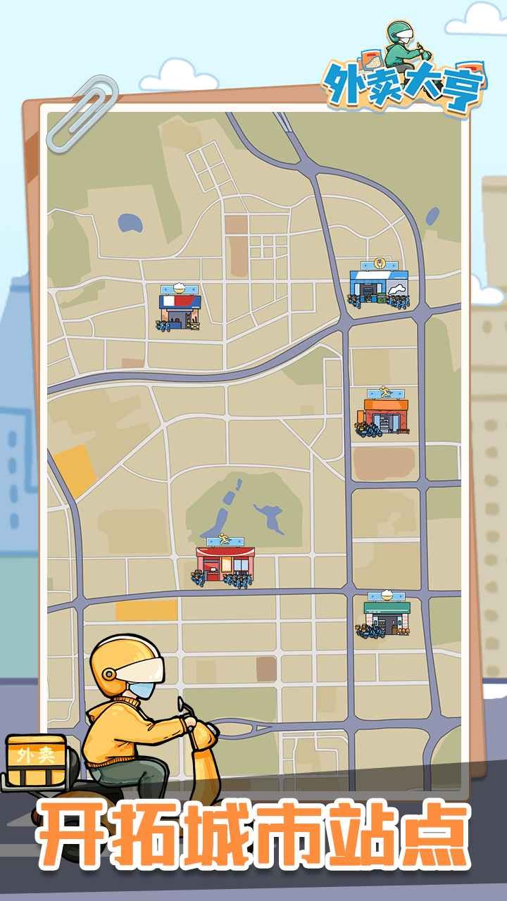 玩家作为一名外卖公司的老板,通过不断地开拓站点、招聘骑手、面试经理,解锁更多的店铺和客户群体,将外卖公司一步步地发展壮大!