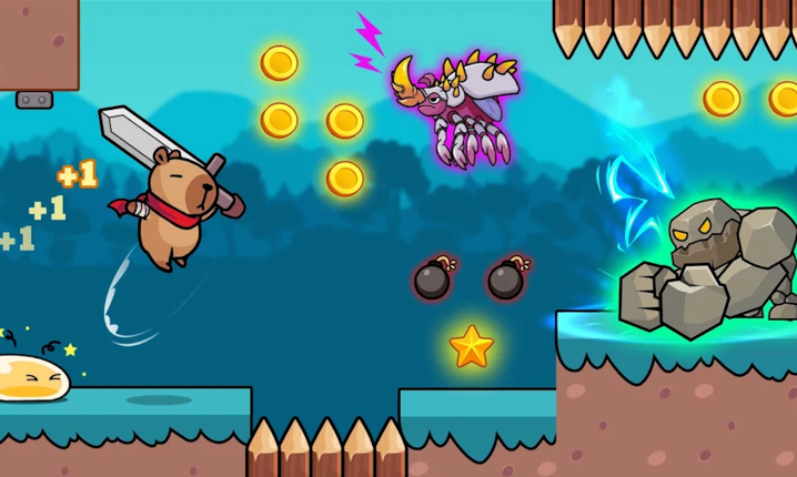 水豚的世界超级奔跑作为一款卡通画风的横版跑酷闯关游戏,操控可爱的卡皮巴拉的角色躲避陷阱,击败游戏中的怪物,收集道具开始游戏闯关,奔跑移动跳跃闯关,更多的玩法等待玩家解锁,升级游戏等级,强化游戏挑战,可爱角色对抗游戏中的副本boss,竞技冒险体验非常精彩,还有不同的水豚角色造型可以自由解锁,不断探索作战,控制自己的角色冒险闯关,趣味游戏挑战,感兴趣的玩家快来游戏冒险闯关吧!