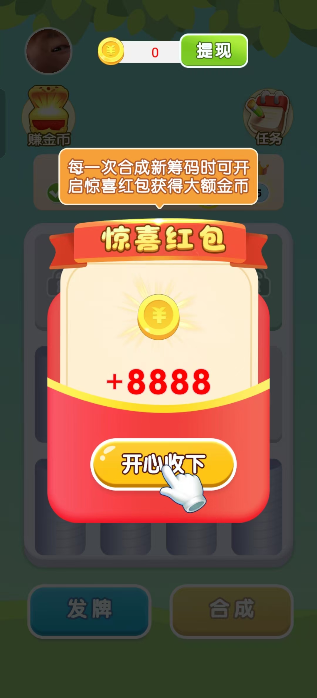 3、每次合成累积奖励,合成的越多收获越多。(每一次合成新筹码时可开启惊喜红包获得大额金)