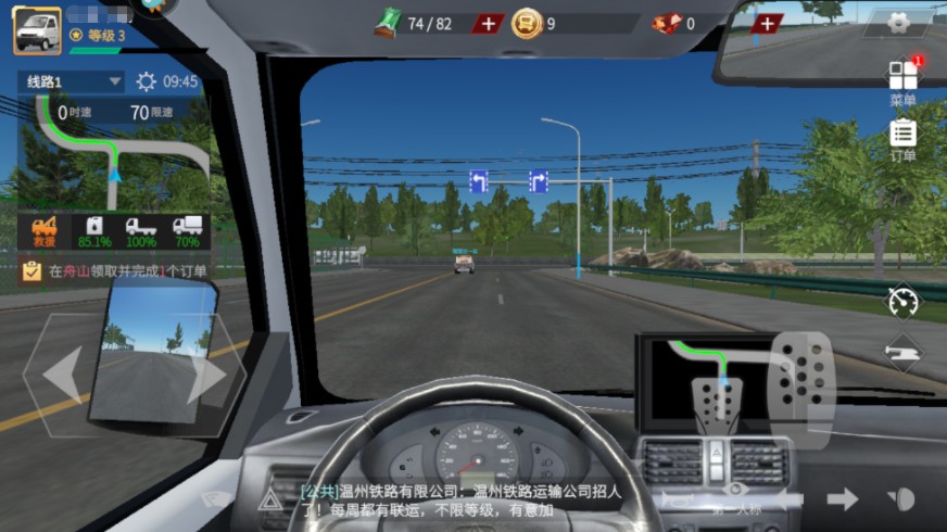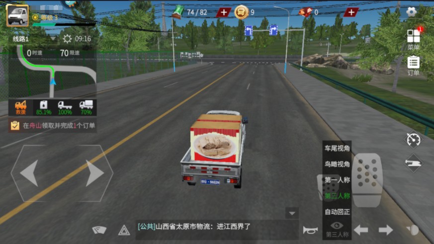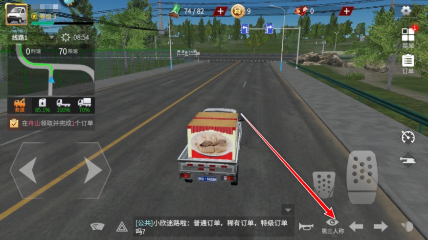 1、进入游戏后,点击右侧的订单,接收,并完成任务,游戏操作很简单,右边加速减速,左边控制方向,还可以使用右下的小眼睛自动回正。