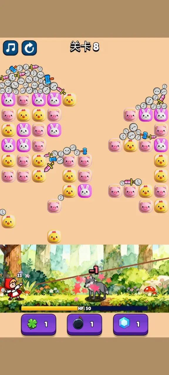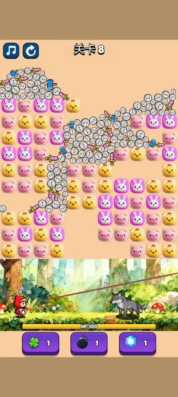 1、玩家爱快速消除,让上方的武器掉落,然后小红帽会拿着他们攻击大灰狼。