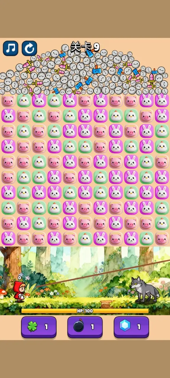 3、森林里,小红帽在回家的路上被大灰狼盯上了,玩家需要通过消除帮助小红帽化险为夷。