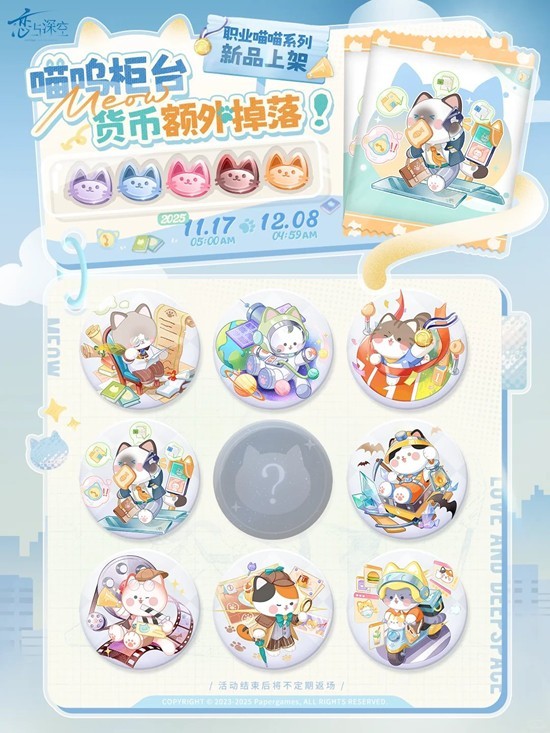 恋与深空喵呜币额外掉落,职业喵喵系列徽章11月17日上新~11月17日~12月8日,全新「职业喵喵」系列喵呜徽章限时上新,收集额外掉落的限定喵呜币来抽取吧!使用限定喵呜币,可在活动期间抽取「职业喵喵」系列徽章。共有8种普通款+1种隐藏款徽章等你收集!一起来和小编看看吧~