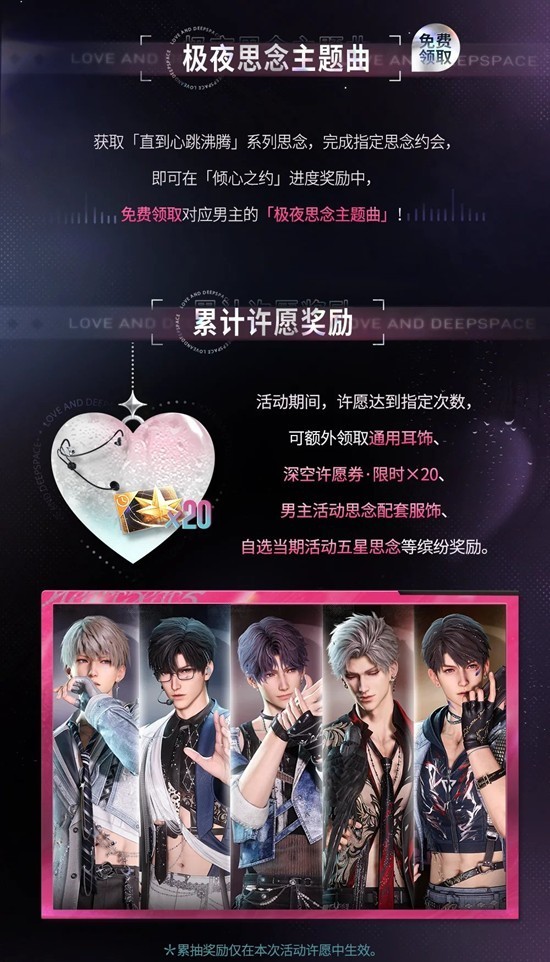 -限时许愿「直到心跳沸腾」开启,系列思念开放获取;满足指定条件,免费获取专属歌曲。更有限时券、配套活动思念服饰、活动思念自选礼盒等许愿次数奖励等你拿!