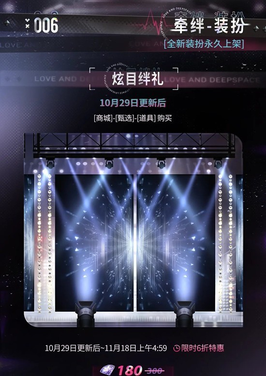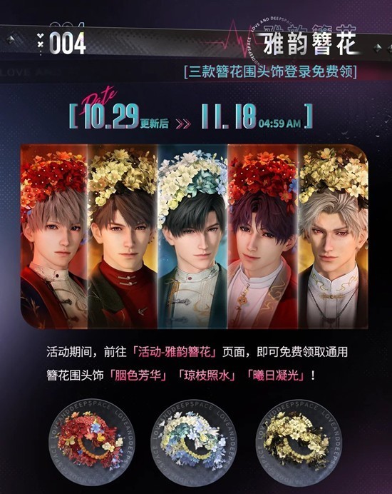 -限时活动「逐夜乘歌」限时开放,音乐响起,与他踏上永夜都市之旅。参与活动可免费获得深空许愿券·限时、全新配饰、拍照动作、纪念称号、手账组件等多种奖励!