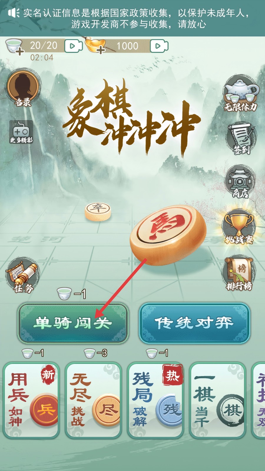 1、进入游戏后,点击【单骑闯关】按钮(消耗1点体力),开启关卡挑战