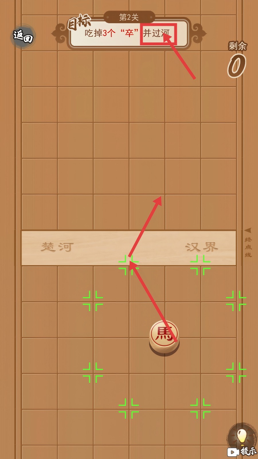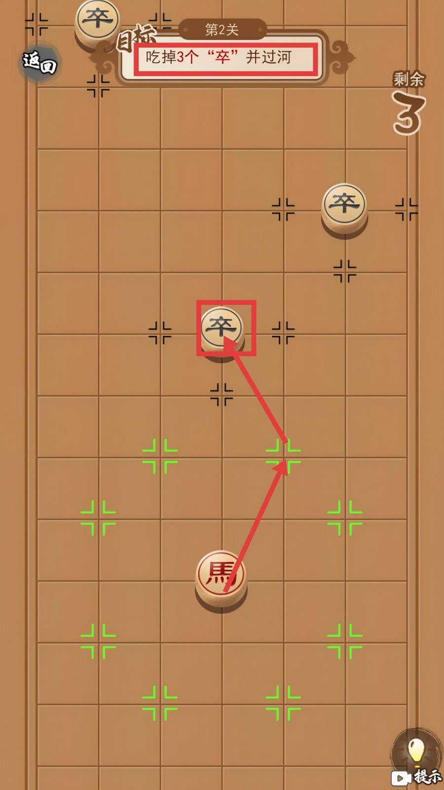 2、第2关要求“吃掉3个‘卒’并过河”。操控“马”按象棋“日”字走法,先瞄准中间的“卒”进攻并吃掉