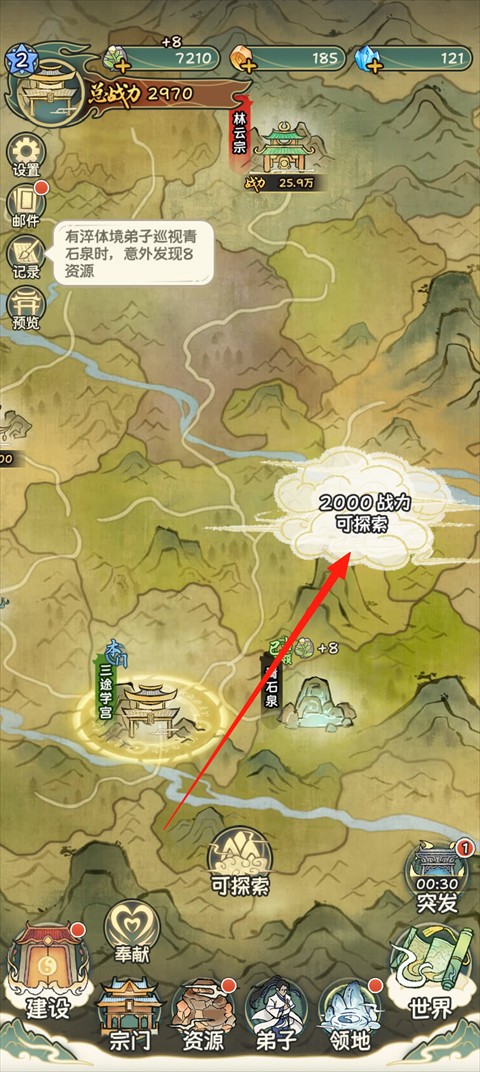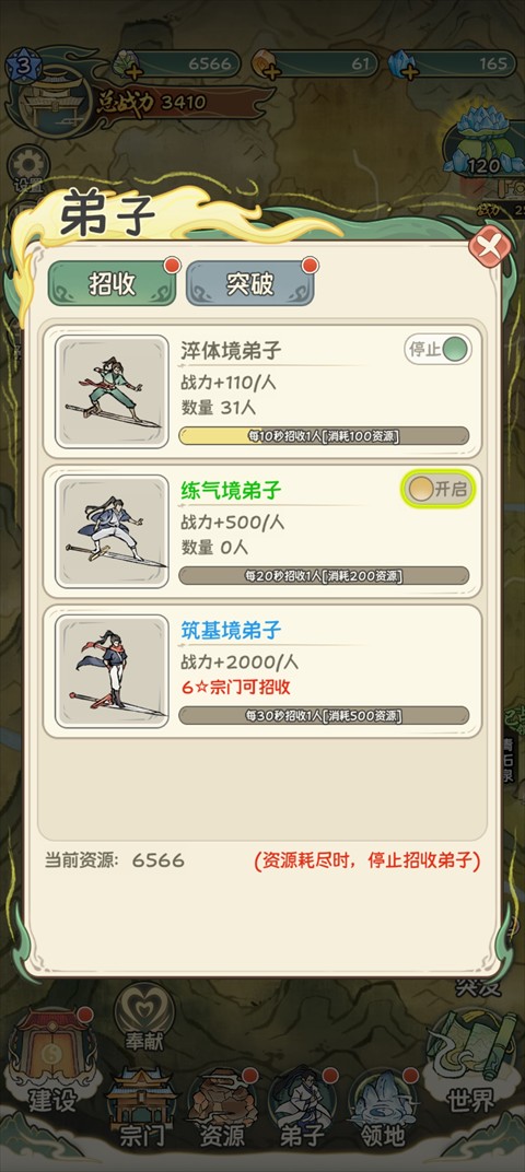 1、玩家进入游戏后,招募弟子逐步占领这个世界,达到战力即可攻占