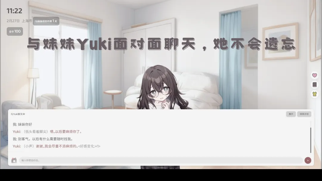 4、妹妹Yuki来了,我们可以与她进行对话聊天,了解她,对话可以自己输入,也可以选择游戏给你的选项。