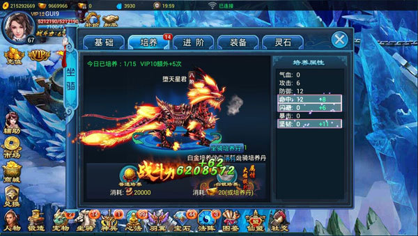 培养:可选择元宝培养或铜钱培养,每天最多10次(随VIP增长增多)。提升坐骑属性较少。