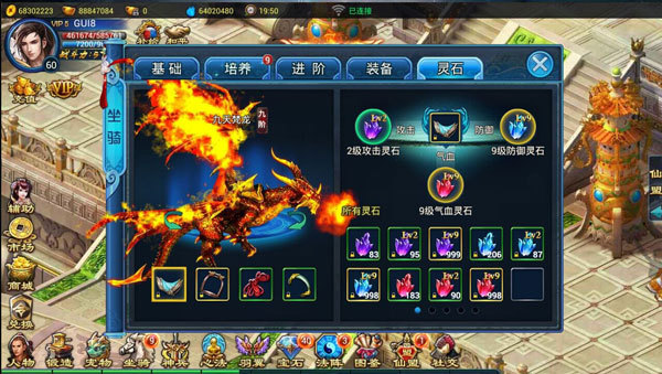 灵石:镶嵌在坐骑装备上,大幅度提升属性,共3种灵石类型,每种分9级。
