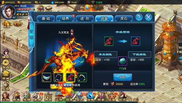进阶:进阶方式为祝福值式升阶,共9阶。进阶后解锁新坐骑外观且属性大幅提升。